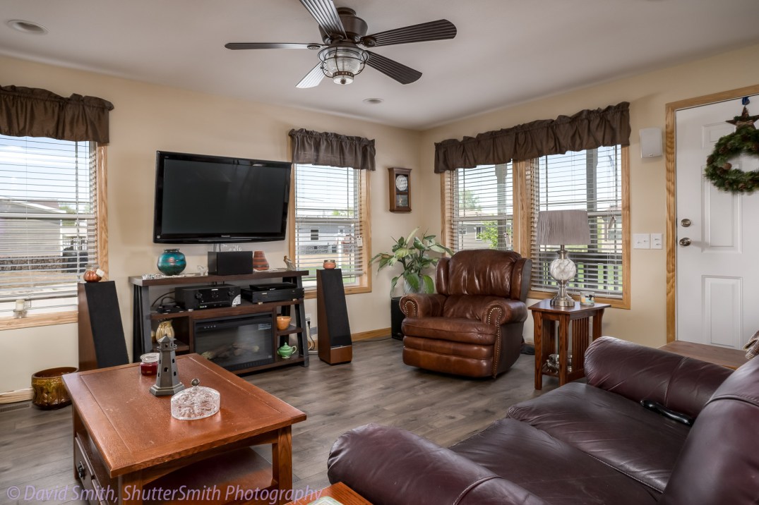 I have seen this technique used in many local area listings. The problem with direct flash is that it leaves a very flat image. Flash will increase detail and reduce or eliminate the blown out windows. But, will leave a cold flat photo. I did a small amount of Lightroom work to reduce the ‘flashy’ look of the photo, but it is difficult to impossible to make much improvement. Also notice the shadows of the fan blades. The unnatural shadows and flatness of the image leaves a less than wow impression. I also had trouble getting the wall the correct color, which usually doesn’t happen in a direct flash… but it can. I worked pretty hard to get it close.